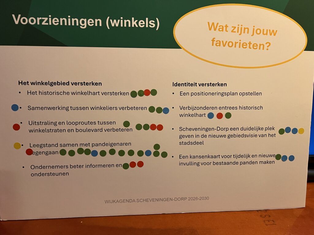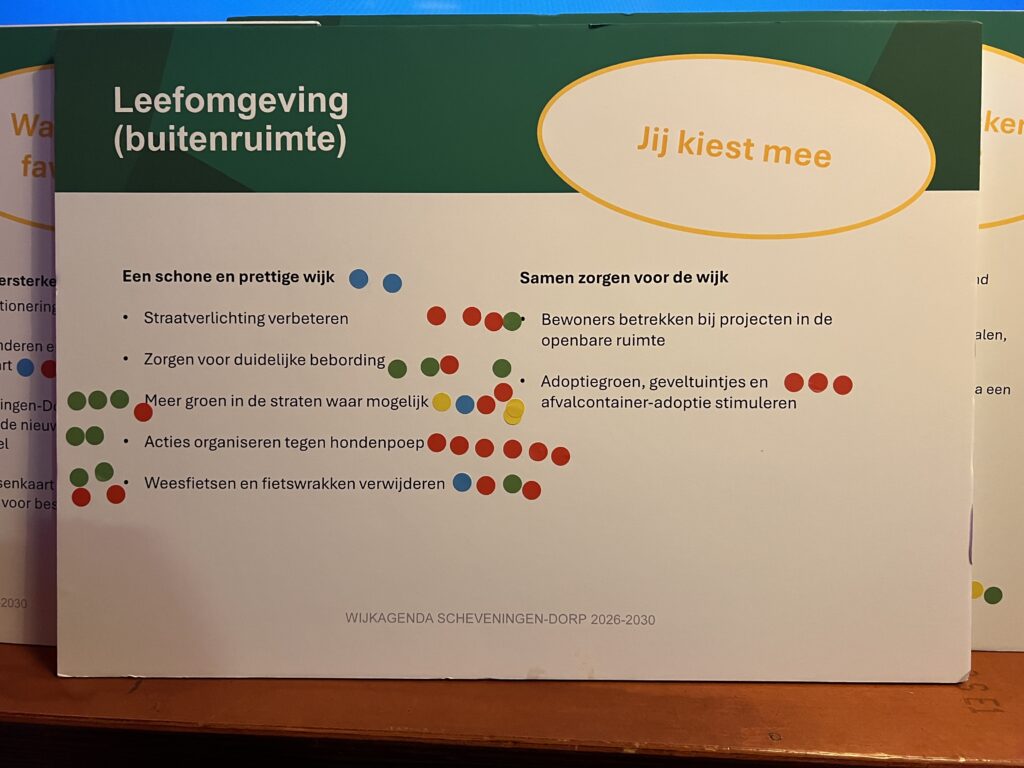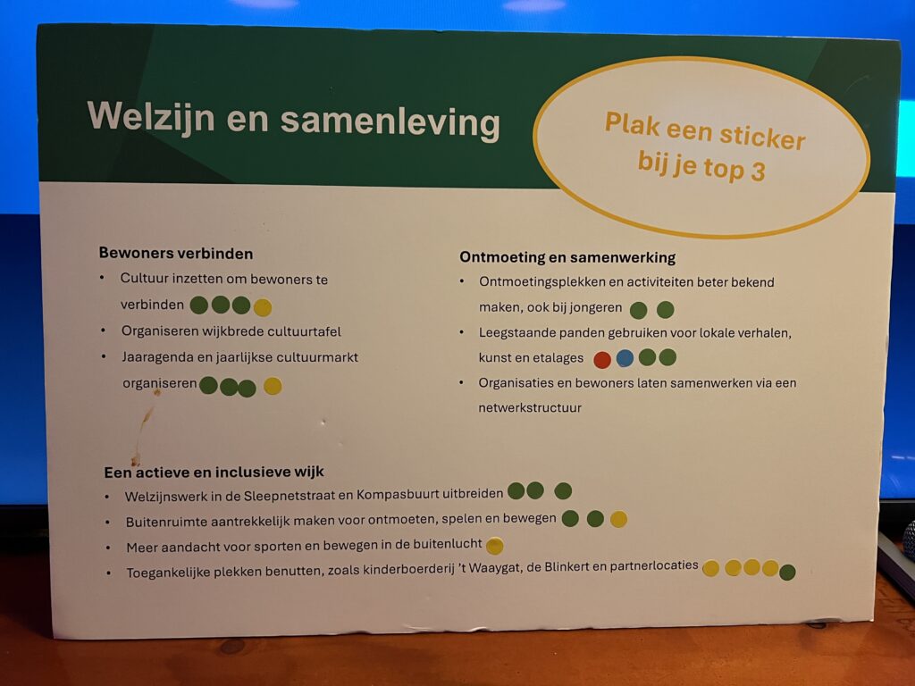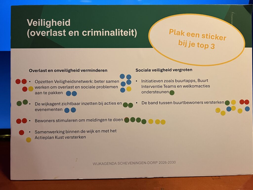 Een belangrijk onderdeel van de avond was de presentatie van de concept Wijkagenda. Aanwezigen konden actief meedenken en met stickers aangeven wat zij de belangrijkste prioriteiten vinden voor de komende jaren. Waardevolle input waar we samen verder mee aan de slag gaan 💬✨